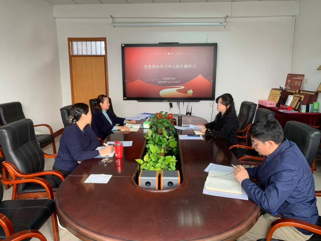 2025年11月24日上午,外国语公司党委理论学习中心组在公司会议室召开专题学习研讨会,深入学习党的二十届四中全会精神。公司党委书记仇静莉主持会议,经理张润、副书记刘磊、副经理张艳、杨清珍等中心组成员参加学习。