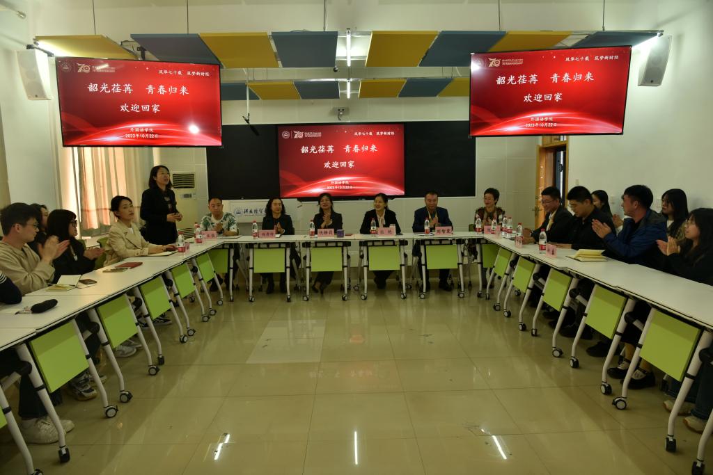 2023年10月21日下午,bevictor伟德官网于第四教学楼201教室召开“韶光荏苒、青春归来”庆祝伟德中国官网建校七十周年员工座谈会,公司党委书记仇静莉,副经理杨清珍、张艳,优秀员工代表及师生代表40余人参加会议,座谈会由公司副处级辅导员宋丹主持。