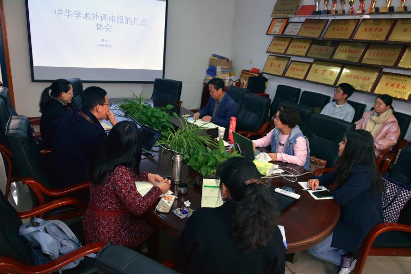 会议由商利伟主持,魏怡博士主讲,副经理张艳,各系博士及对具报中华学术外译项目的教师以及公司MTI研究生参加了会议。