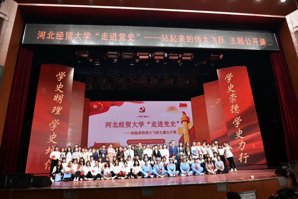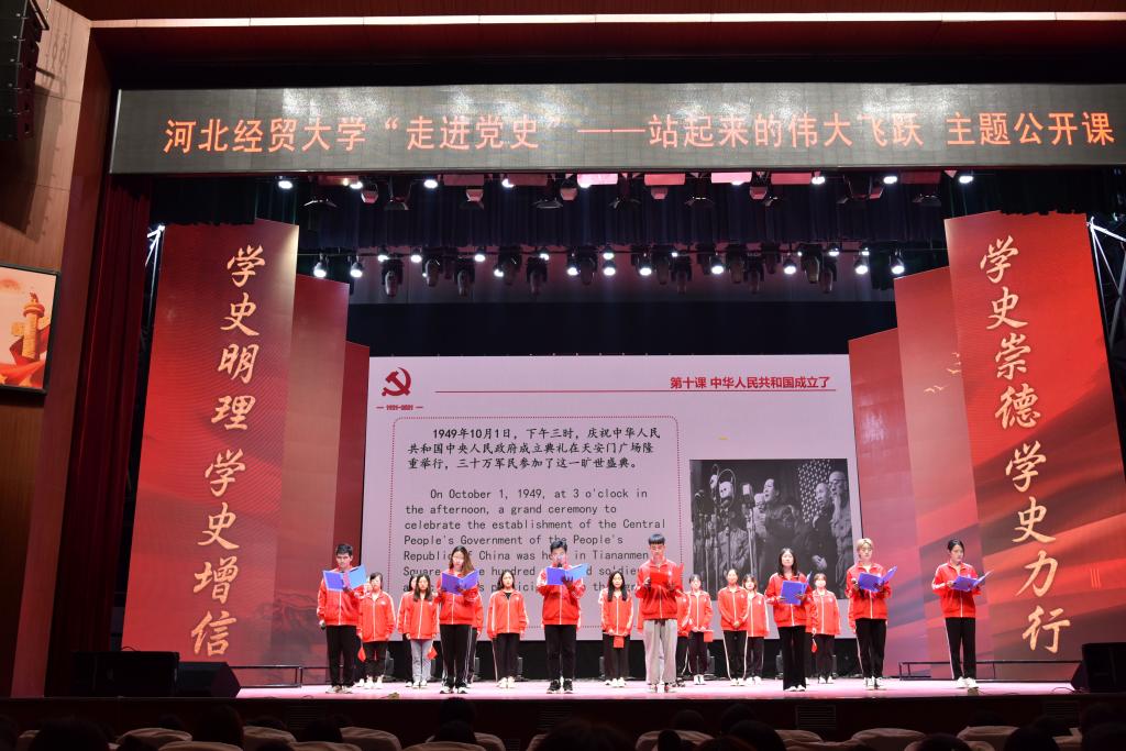 公开课由bevictor伟德官网员工党支部书记李维婷,教师贾春晓、郭朝云、韩智巍主持。此次公开课以建党100周年为契机,将1921年中国共产党建党至1949年中华人民共和国成立,28年艰苦卓绝的奋斗历程浓缩成十个章节,分别为:其作始也简的大事变 、大革命的高潮、敢不敢坚持革命、农村包围城市、敌后战场的开辟与发展、夺取抗日战争的伟大胜利、重庆谈判、千里跃进大别山、抓住有利时机进行三大战役、中华人民共和国成立了。涵盖了实现站起来的伟大飞跃过程中重要时间节点、历史事件、革命思想与伟大精神。一段段历史鲜活的呈现出来:跟随同学们生动的情景剧踏上嘉兴南湖的红船,见证中国共产党的产生与壮大;在慷慨激昂的朗诵中感悟一个个中国共产党人坚定的信念,势必要将革命坚持到底;在嘹亮的歌曲《国家》中点亮星星之火,大胆选择农村包围城市,武装夺取政权——这条前人没有走过的道路;在《沁园春•雪》的深情朗诵中充分展现重庆谈判时中国共产党坚持和平、民主、团结的主张;随着对三大战役的深情讴歌,七届二中全会的胜利召开,为新中国绘制了蓝图,1949年10月1日,中国向世界宣告,中华人民共和国成立了!课程最后《歌唱祖国》熟悉的旋律响起,台上台下师生共同合唱,“五星红旗迎风飘扬,胜利歌声多么嘹亮。歌唱我们亲爱的祖国,从今走向繁荣富强……”,既唱出了每个中华儿女对祖国走向繁荣富强的骄傲,又唱出了对祖国母亲的赞美以及高度的自信,进一步激发了现场师生的爱国、爱党热情,将整堂课程推向高潮。