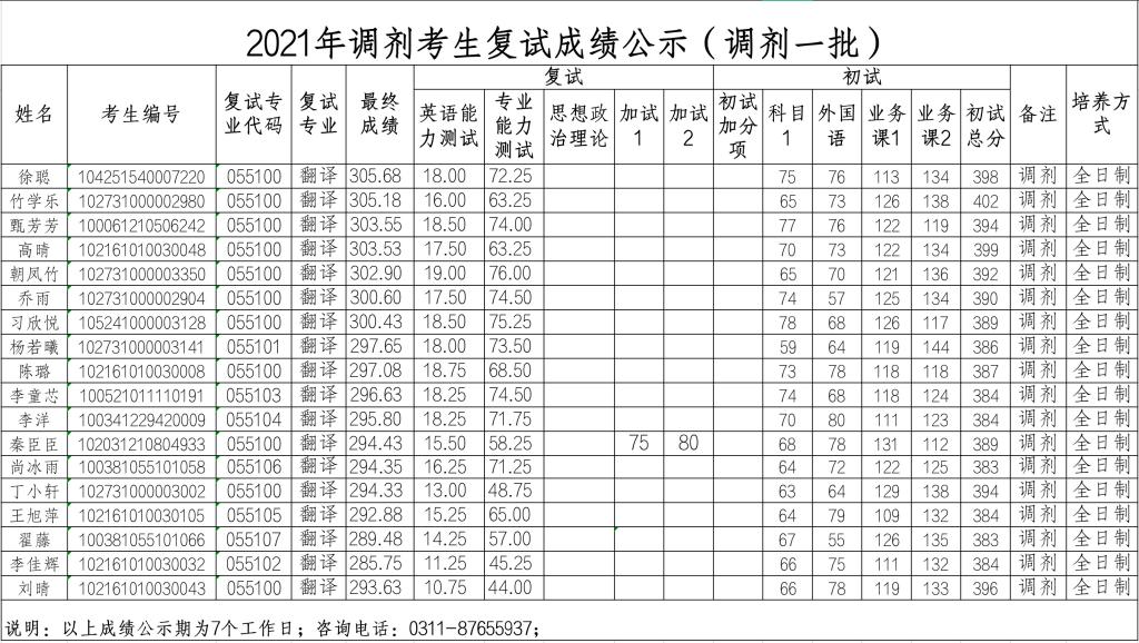 2021年调剂考生复试成绩公示(调剂一批)