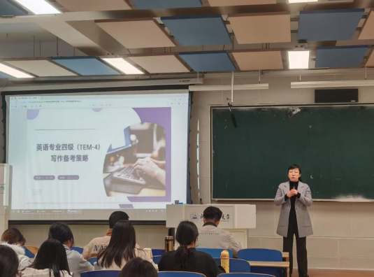 讲座由bevictor伟德官网副教授、硕士生导师郑月波老师主讲。郑老师围绕专四写作的技巧与方法进行了深入浅出的讲解,特别强调了写作部分在英语专业四级考试中的重要地位。