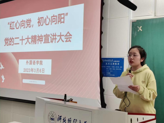 大会首先宣布了10余名师生党员为主组成的宣讲团名单,接着由郑雪傲、卫雨欣、滕婉君、曹岩4名成员进行了首场宣讲。