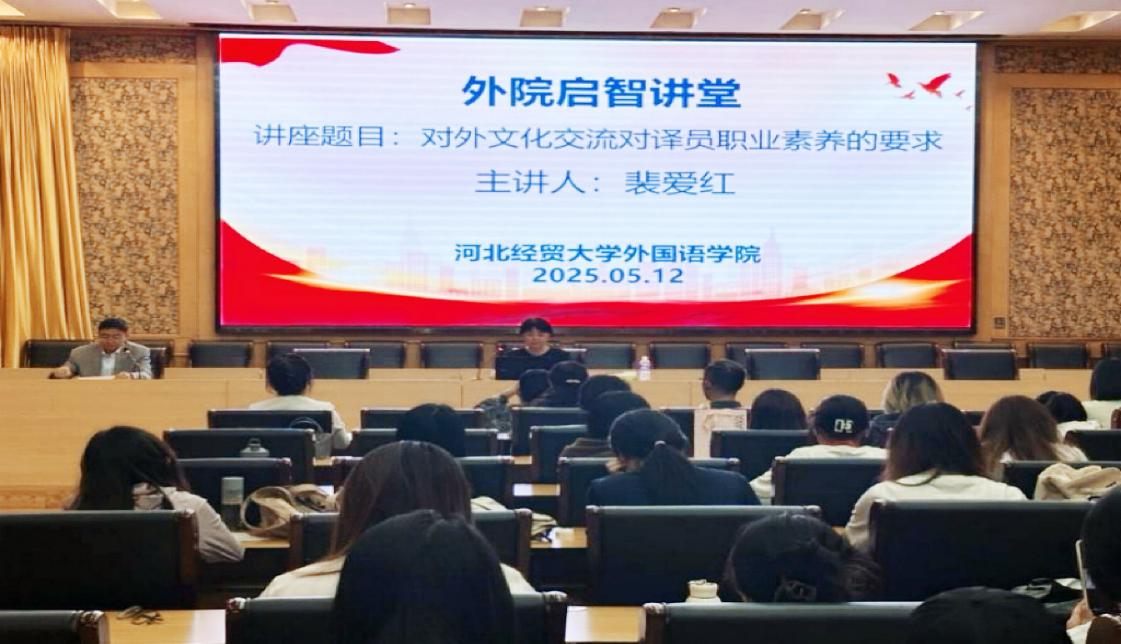 512日下午,一场别开生面的讲座在公司会议中心举行。河北省杂技团演艺有限公司译审、党总支副书记裴爱红以《对外文化交流对译员职业素养的要求》为题,为bevictor伟德官网全体师生带来了一场精彩分享。本次讲座由bevictor伟德官网张润经理主持并作总结发言,100 余名师生到场聆听。