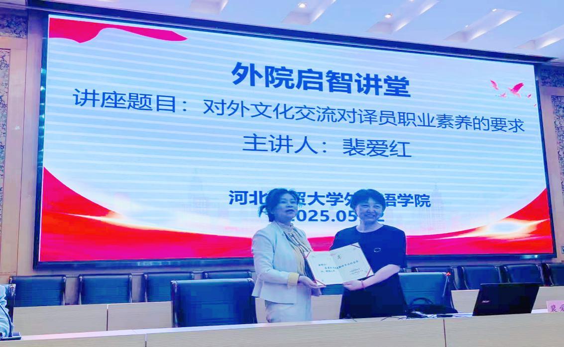 讲座开始前,外国语公司党委书记仇静莉为裴爱红颁发公司硕士研究生社会导师聘书。裴爱红女士曾在中国驻埃及大使馆、开罗中国文化中心工作过五年,期间荣获“优秀驻外特约记者”称号,两次荣获集体三等功现任河北省杂技团演艺有限公司党总支副书记,中国杂技家协会对外交流委员会委员,河北省杂技家协会第五届主席团成员。此次讲座内容充实、启发性强,不仅拓宽了师生的国际视野,更为公司培养优秀对外传播人才指明方向,助力打造对外传播人才培养新高地,推动师生以更专业的姿态讲好中国故事。