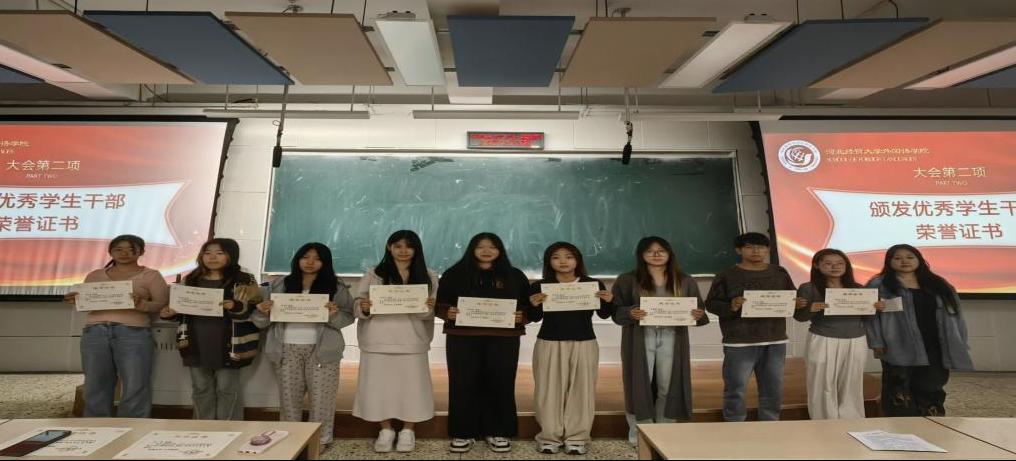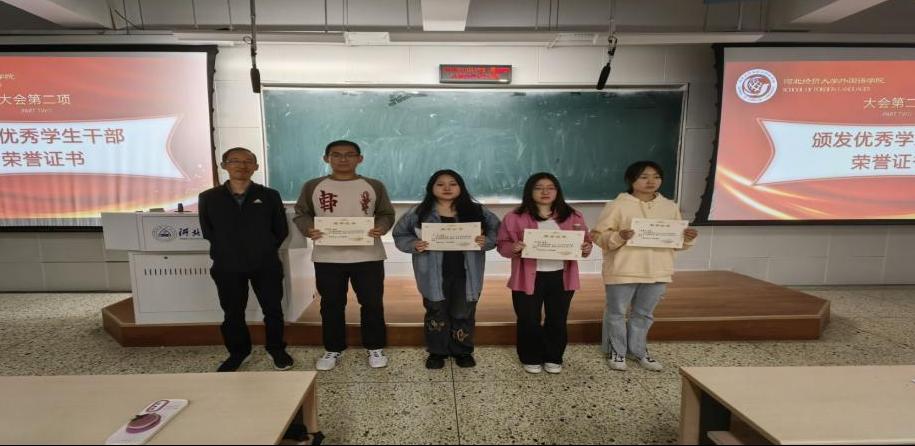 表彰环节,刘磊、付磊老师及于洋同学共同为在过去一年中表现突出的员工会优秀干部颁发了荣誉证书。