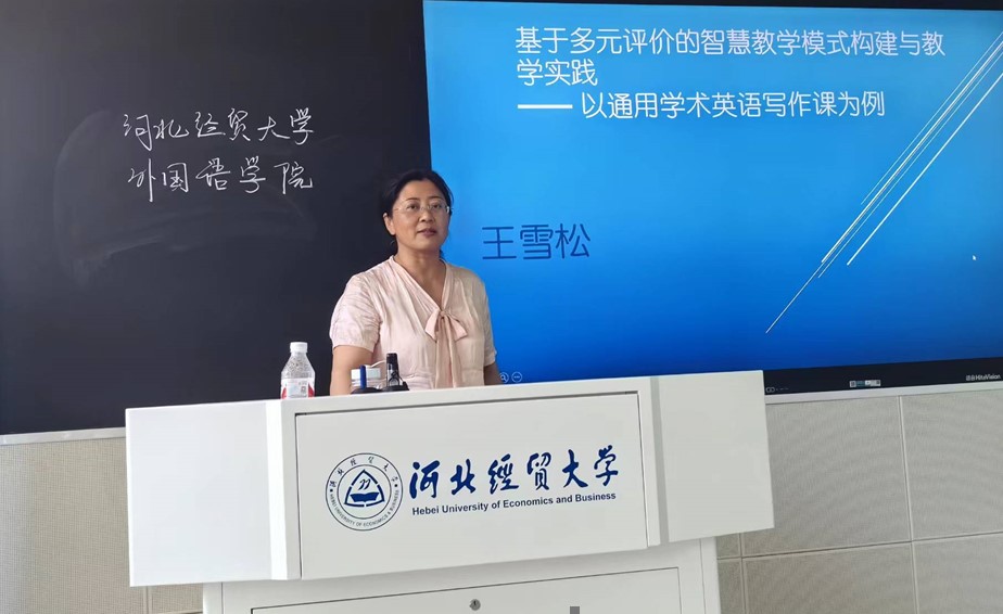 王雪松老师从智慧教学的源起、写作课教学困境、智慧教学模式的设计与理论依据、教学实验过程与数据分析、研究结论与启示等,详细介绍了在通用学术英语写作课上如何深入融合过程体裁法和智慧教学平台iWrite ,构建基于多元评价的写作课智慧教学模式,并检验教学实验效果。使师生们对智慧教学模式有了切实的认识和体会。随后的交流讨论环节中,与会教师就上述问题进行了热烈的讨论。