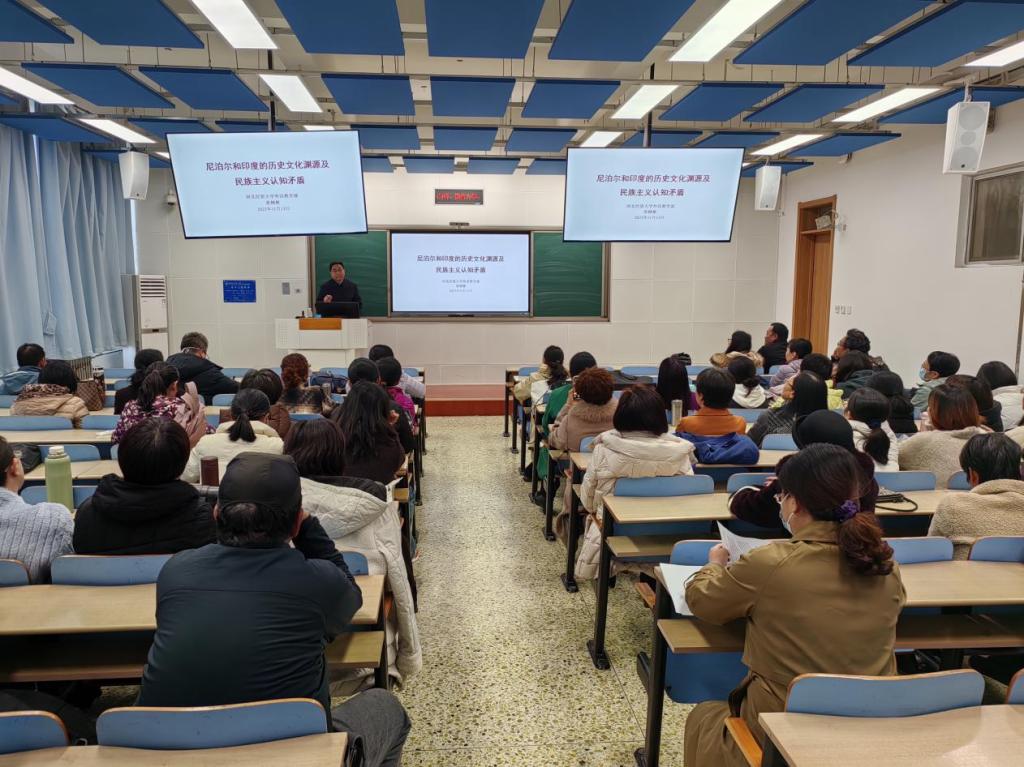 11月13日下午,外语教学部举办了2023年度第2期“双百论坛”活动,外语教学部教师张树彬教授受邀做了题为“尼泊尔和印度的历史文化渊源及民族主义认知矛盾”的学术报告,外语教学部近70位教师参加了讲座。